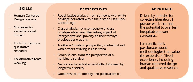 Milo earned a graduate degree at the Maryland Institute College of Art studying how to use equity-based HCD for systemic social impact. Previously, they earned a Bachelor’s degree with honors from the Public Policy department at the University of North Carolina at Chapel Hill, with a focus on using qualitative methods within social entrepreneurship and international development.