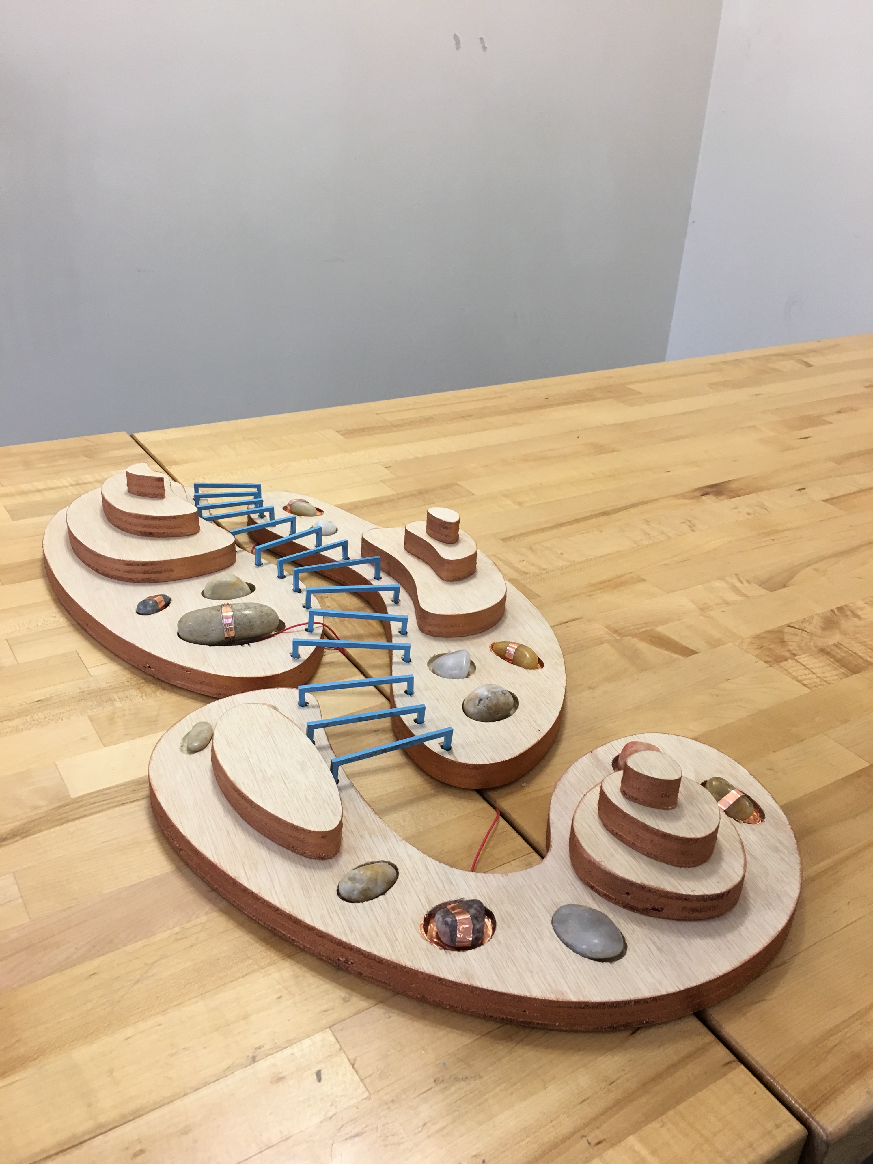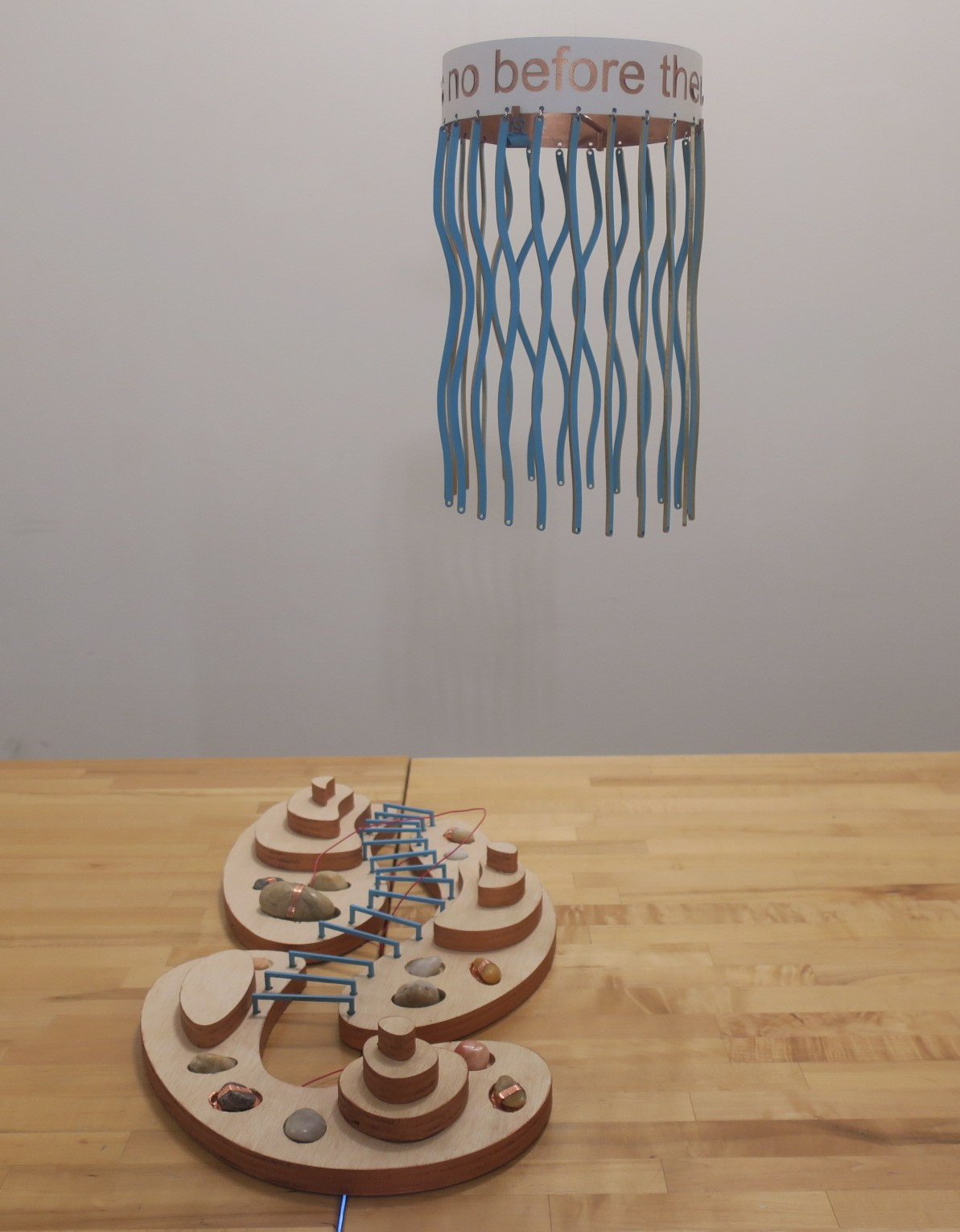 Milo created their Healing Isn’t Linear project to explore the themes of healing and community. The piece is an interactive installation which plays recordings of people who have been a part of their own healing process saying the phrase, “Healing is [participant inserts their own response].” The recordings are triggered to play when a someone picks up one of the stones within the sculpture.