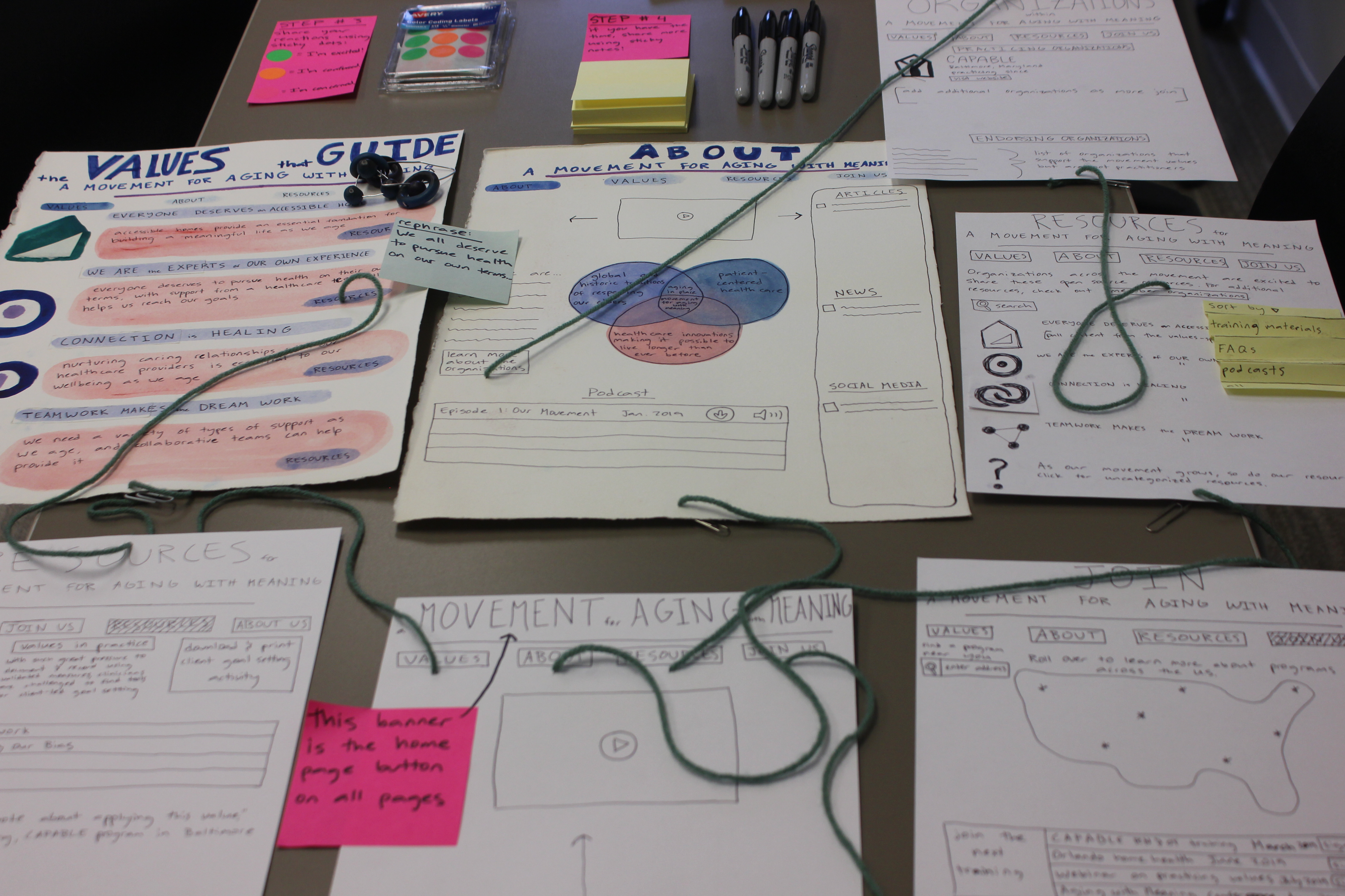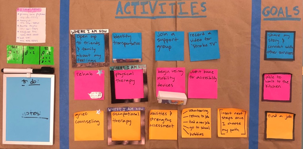 The above are all prototypes I created for a project funded by the American Heart Association to improve the healing journey for stroke survivors. I use a wide variety of mediums when I make prototypes, from low fidelity creations quickly pieced together from recycled materials, to higher fidelity designs laid out in InDesign. Not pictured are a set of cards I created for a card sort activity, as well as a higher fidelity prototype of an app–a clickable simulation the user interface through Keynote.